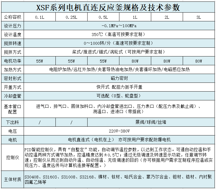 材質(zhì)一般有碳錳鋼、不銹鋼、鋯、鎳基(哈氏、蒙乃爾、因康鎳)合金等有色金屬及其它復(fù)合材料,加熱/降溫方式,可分為電加熱、熱水加熱、導(dǎo)熱油循環(huán)加熱、蒸汽加熱、遠紅外加熱、外(內(nèi))盤管加熱、電磁感應(yīng)加熱等,夾套降溫和釜內(nèi)盤管降溫等。加熱方式的選擇主要跟化學(xué)反應(yīng)所需的加熱/降溫溫度,以及所需熱量大小有關(guān)。攪拌器有錨式、框式、槳式、渦輪式,刮板式,組合式等多層復(fù)合槳。根據(jù)不同工作環(huán)境的工藝需要進行設(shè)計、制造。